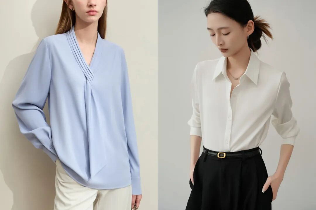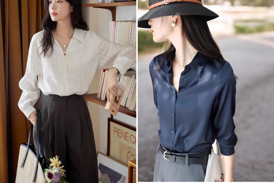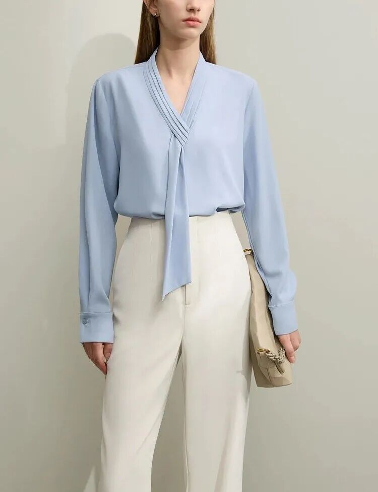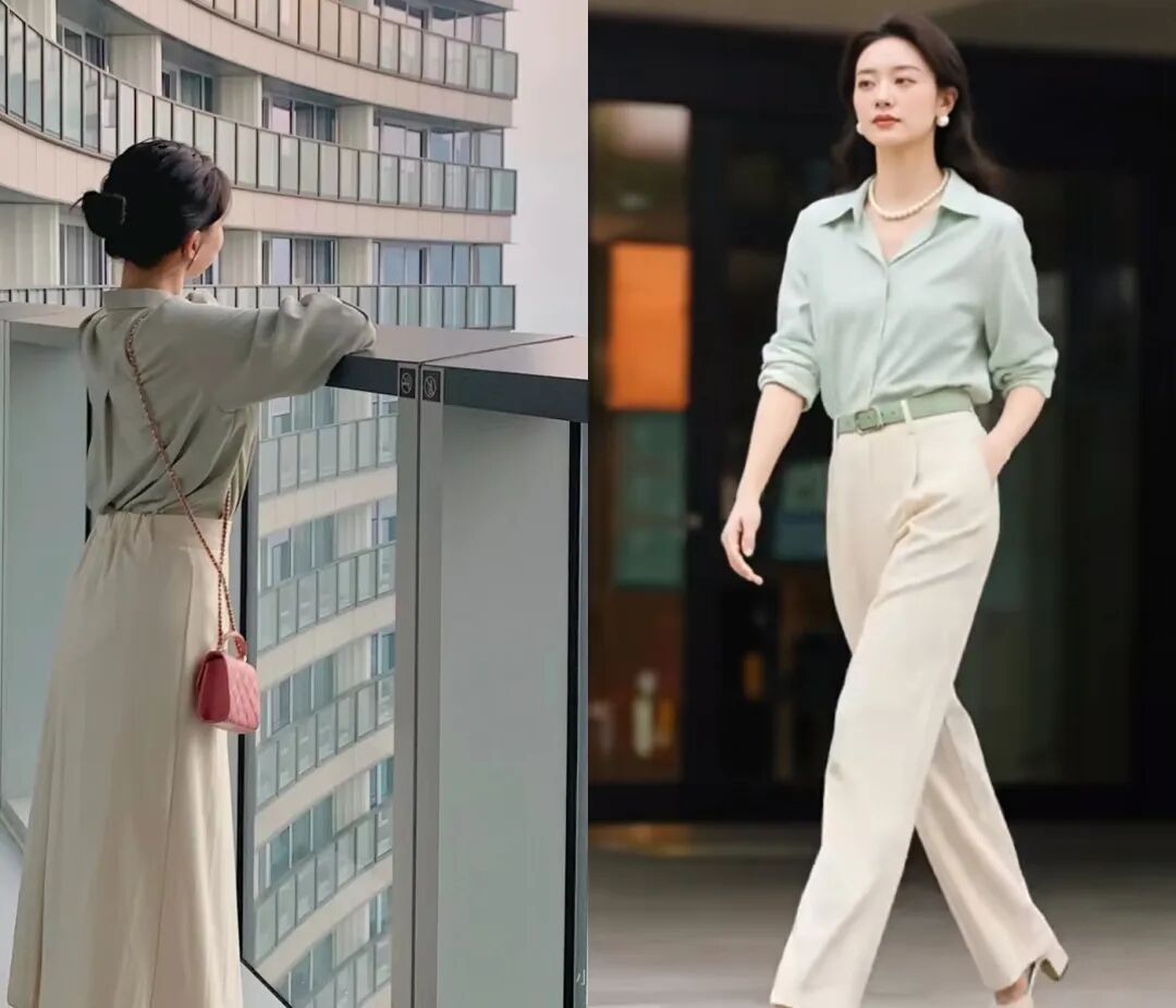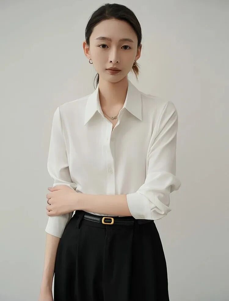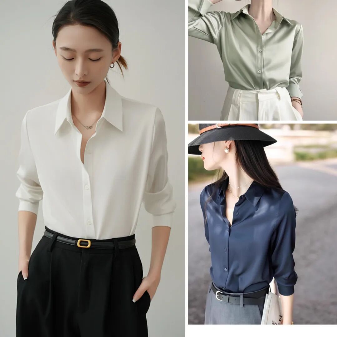 缎面雪纺衬衫收受的则是优质的仿真丝面料,一穿上就有「轻熟、尺度、和睦」的氛围感。