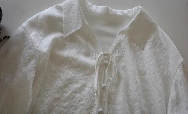 整件衬衫走线工致,从领口到前襟下摆,莫得一点实足的线头,针脚精良无比,衣领系带谋划。