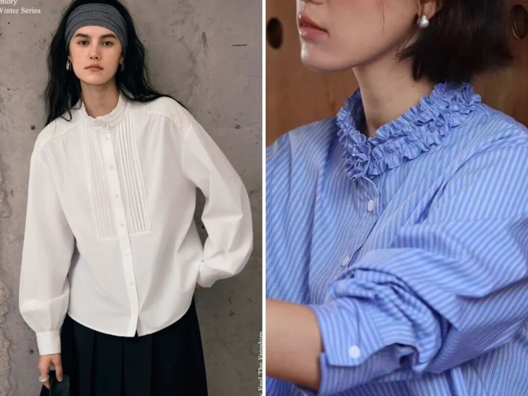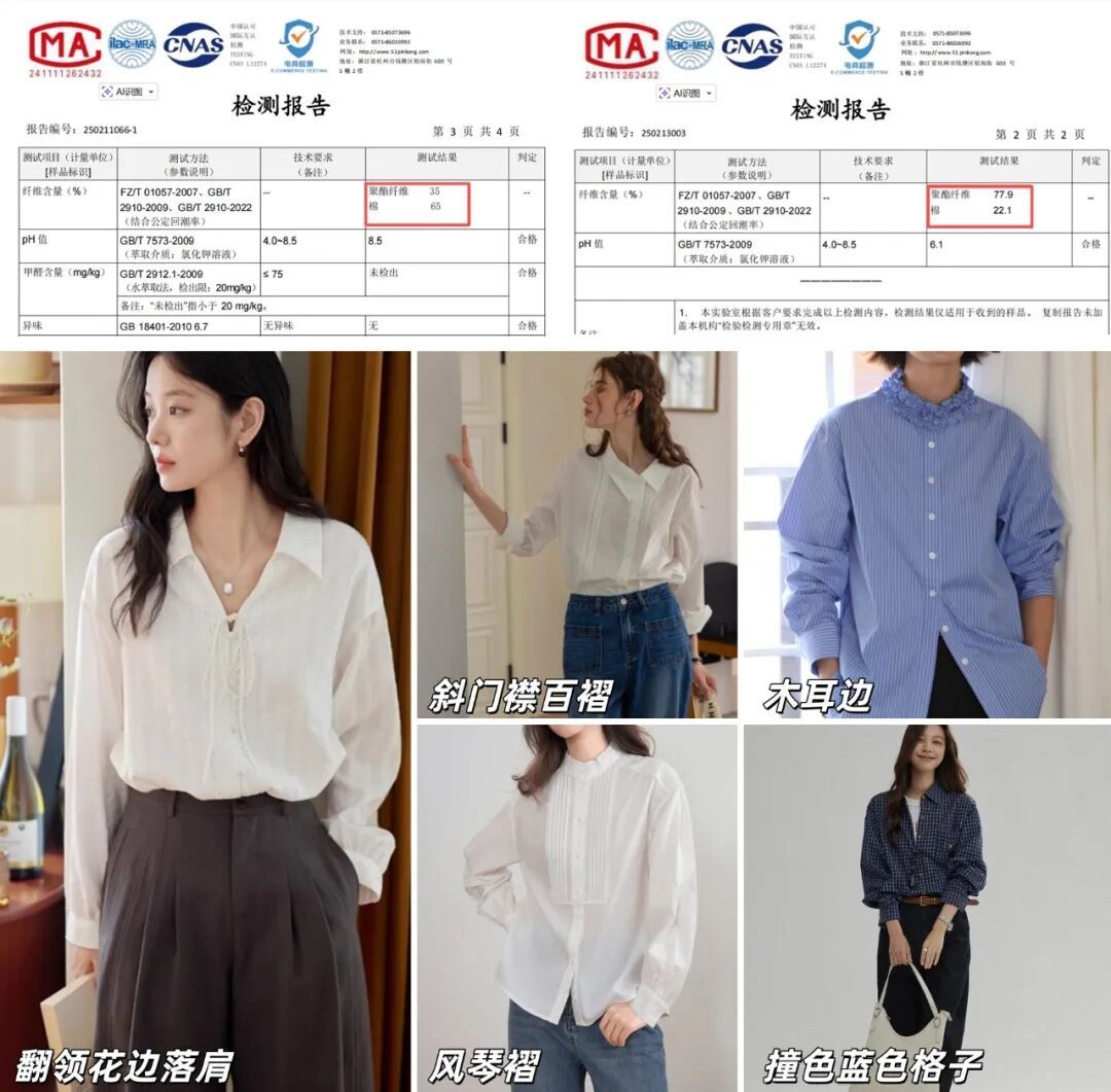 风琴褶、木耳边、撞色蓝格子款齐是黄金配比的65%棉+35%聚酯纤维,战斗皮肤柔滑不扎身,像挤入一派棉花海洋里;斜门襟百褶、翻领花边落肩款是22.1%棉+77.9%聚酯纤维,典型的抗皱易收拾“商务款”,同期保留了棉的亲肤性。