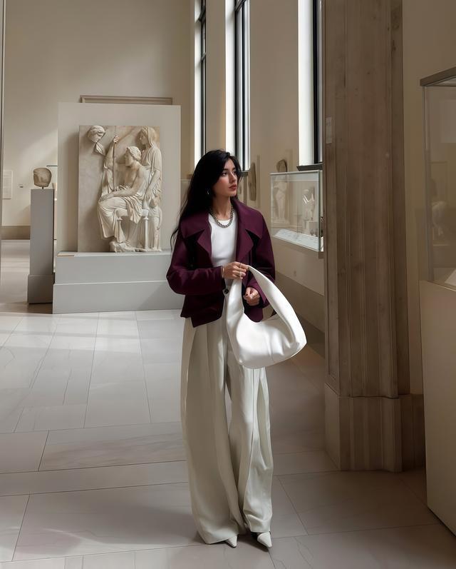 口角两色非论放在什么步地都不会出格,小香风外衣的长度本人就短,刚好卡在腰线,再配一条高腰的奶白阔腿裤,腰线明确、下半身延展面积大,东说念主看起来挺拔修长。