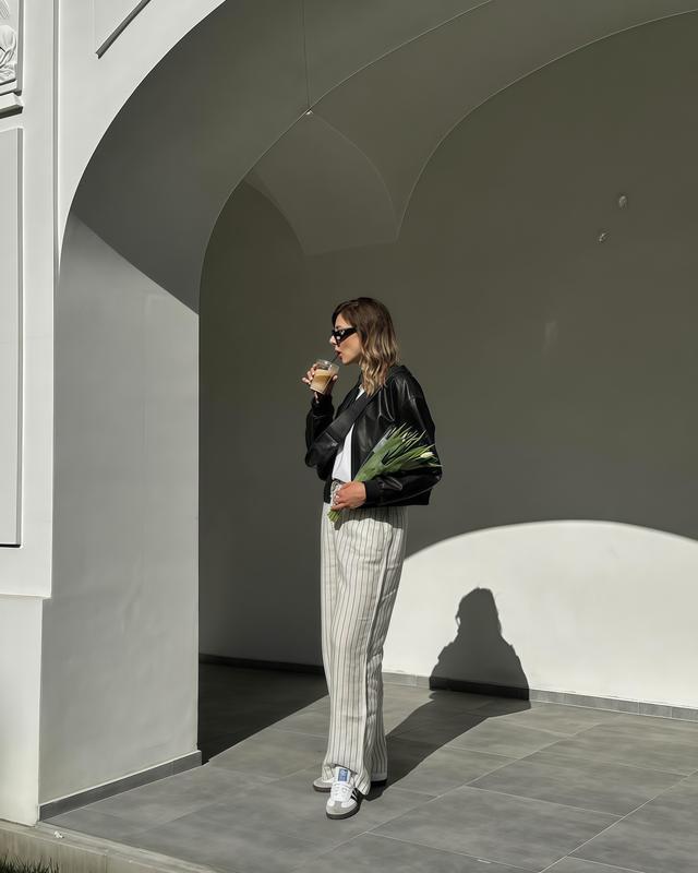 ▶ 黑皮衣+条纹阔腿裤,纵向线条从视觉上拉长腿
