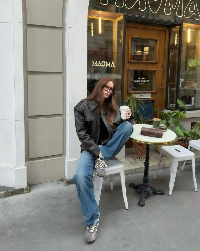 周末不思穿得太矜重的时候,黑皮衣搭一条浅蓝色牛仔阔腿裤就很合适,牛仔面料自带失业感,浅蓝色不千里,和黑皮衣放在沿途有浅深对比,穿出来粗疏但不暗昧。眼下踩一对帆布鞋或畅通鞋,外出买个咖啡逛逛街,穿这一套完全够了。