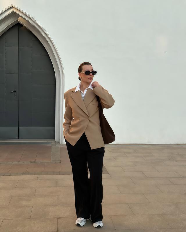 ▶ 驼色短西装+白衬衫+黑阔腿裤,浅深分层更干练