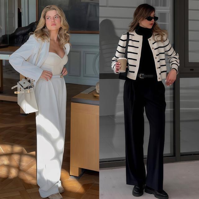 ▶ 玄色小香风+奶白阔腿裤,经典配色龙套易出错