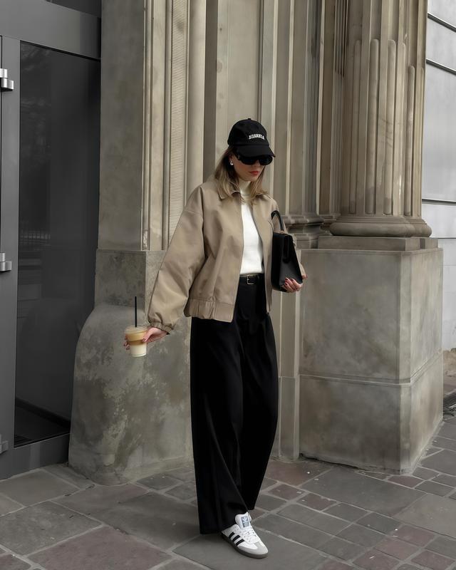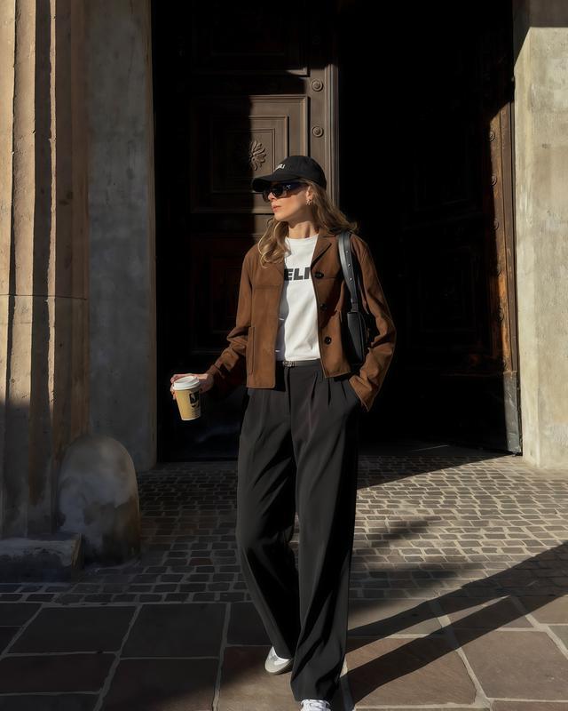 ▶ 驼色皮质短夹克+黑阔腿裤+畅通鞋,粗疏但不暗昧