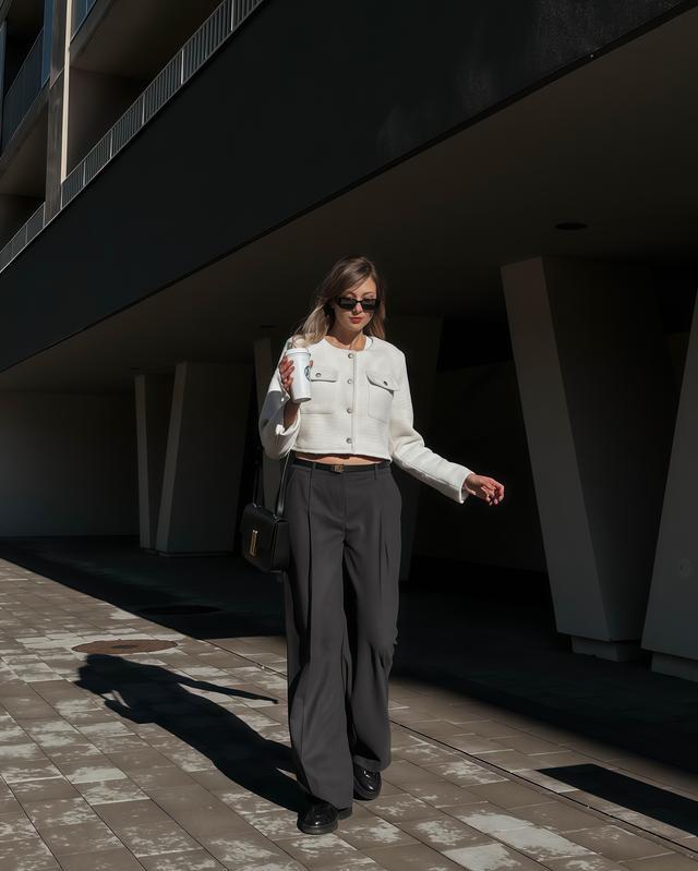 粗花呢面料的小香风外衣,自带一种追念的滋味,白色粗花呢配上深灰阔腿裤,上头淡色、底下深色,看起来很幽静。