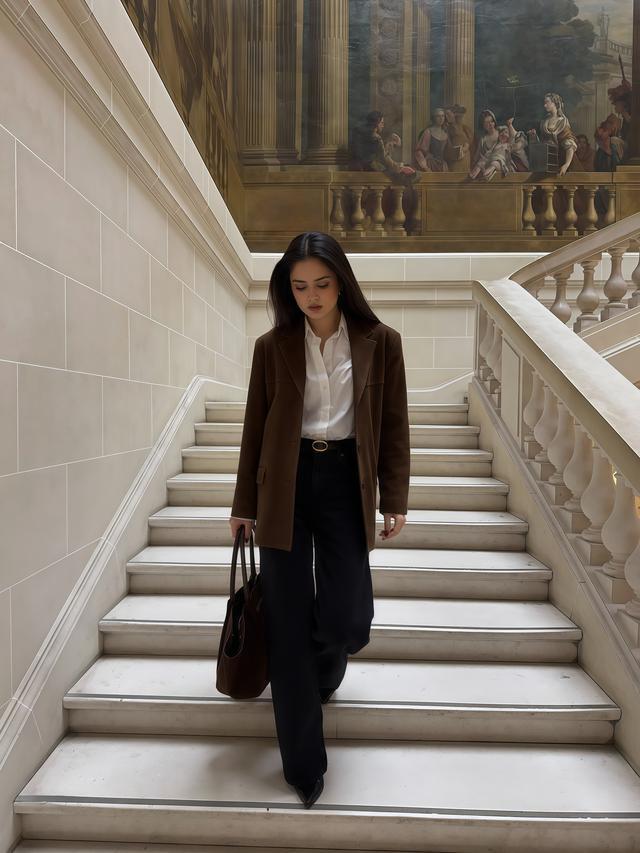 思要穿出干练气质感的姐妹,径直选驼色短西装+白衬衫打底,底下接一条玄色阔腿裤,三个颜料浅深分开,色块之间畛域明晰,穿出来有章法当然不会乱。