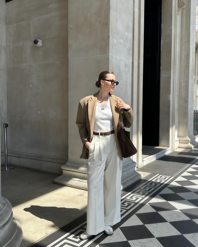 ▶ 驼色短西装+白T+白阔腿裤,淡色一体更细微