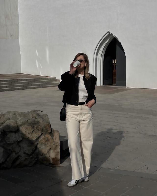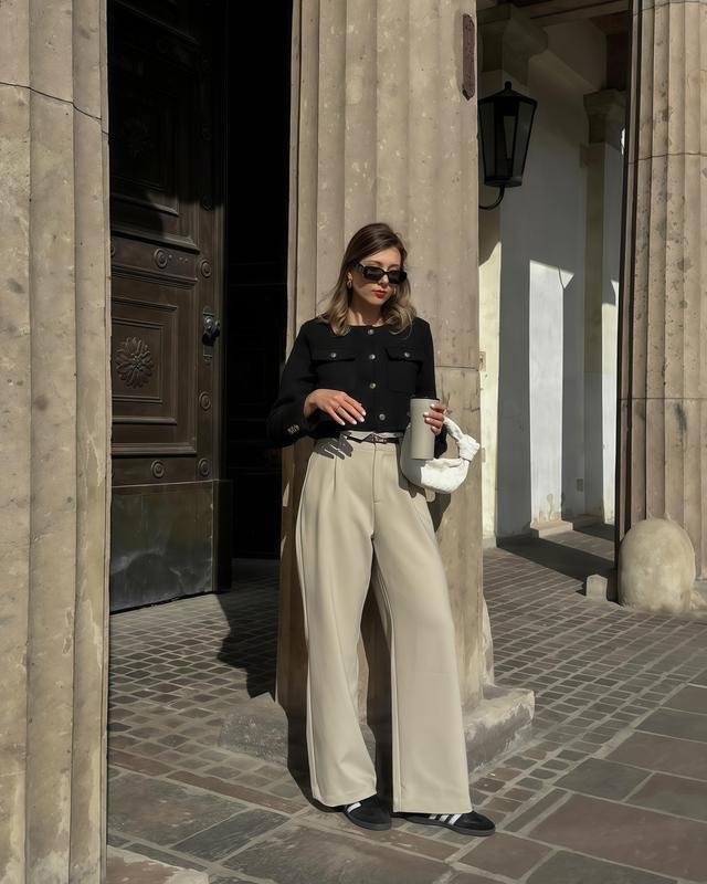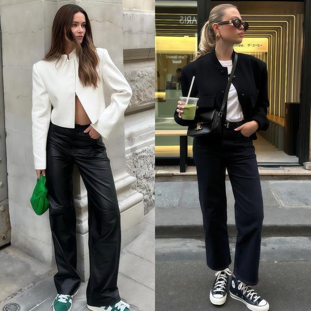 ▶ 玄色短夹克+奶白阔腿裤+畅通鞋,口角配最平缓