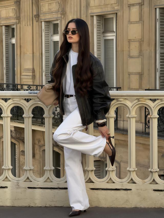 在宽广配色上,最稳的等于口角搭,上头黑皮衣、内部白T、底下白阔腿裤,颜料不花哨,皮衣的硬朗质料,配上阔腿裤的宽松垂坠,穿出来利落有型。