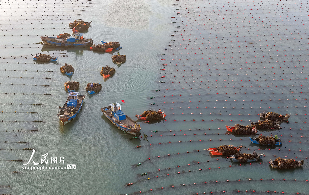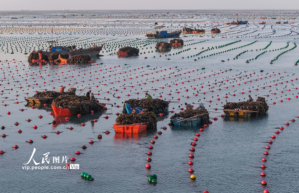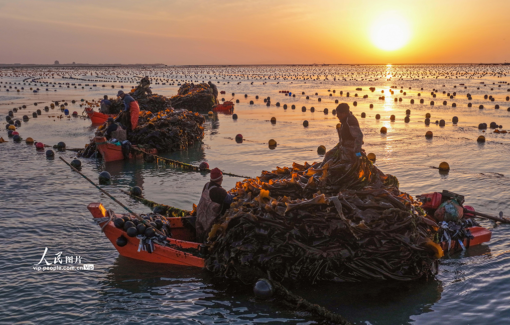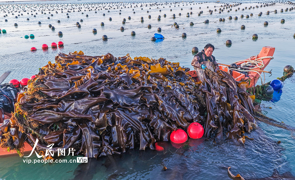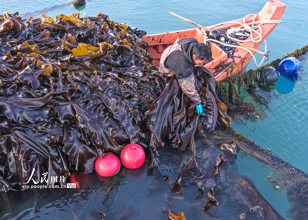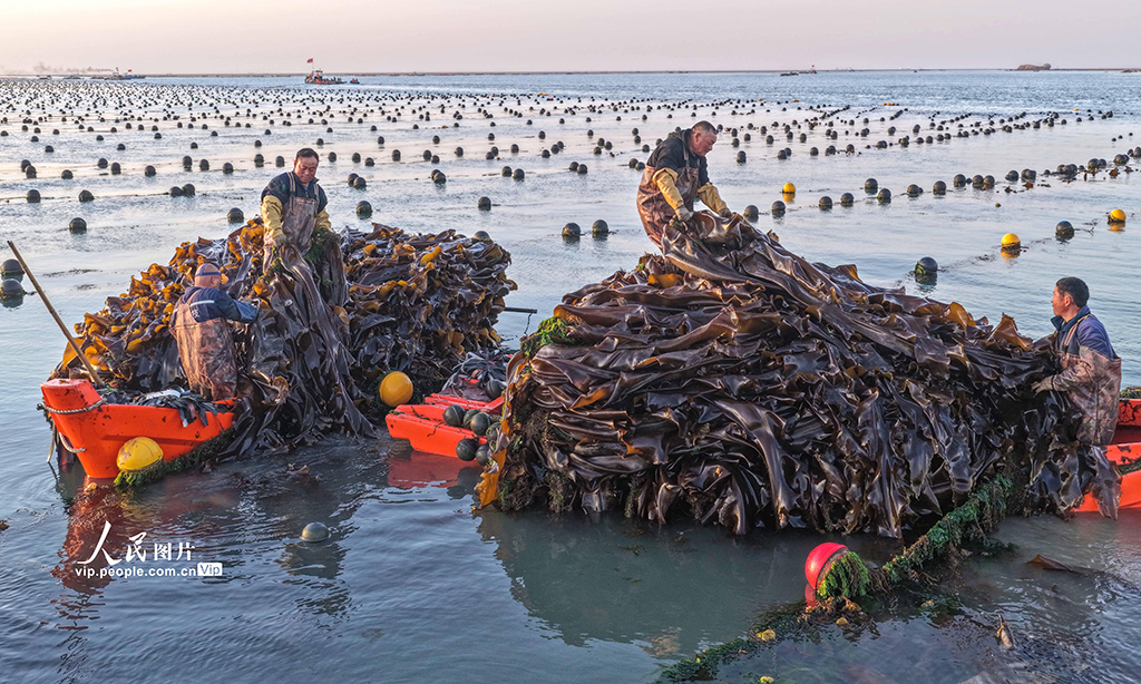 真钱三公棋牌官网孳生工东说念主正加紧采收海带,供应市集。李信君摄(东说念主民图片网)" />