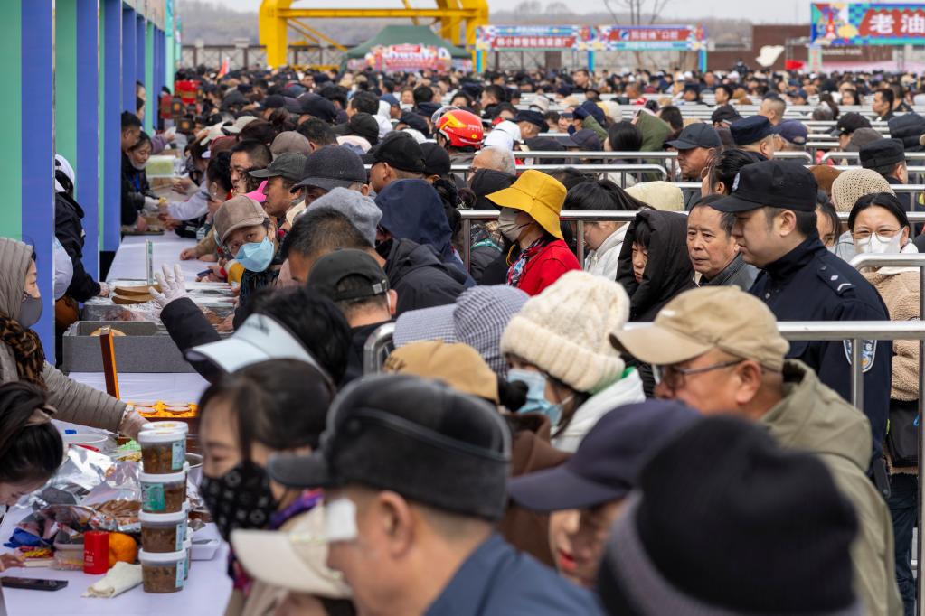 东谈主们在喊江节现场列队试吃好意思食。 新华社记者 张涛 摄