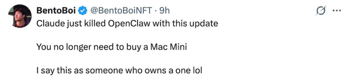 另一位AI博主BentoBoi则以为:“此次更新还是把OpenClaw干掉了”,并补充称,“你不再需要有益买一台Mac Mini”。