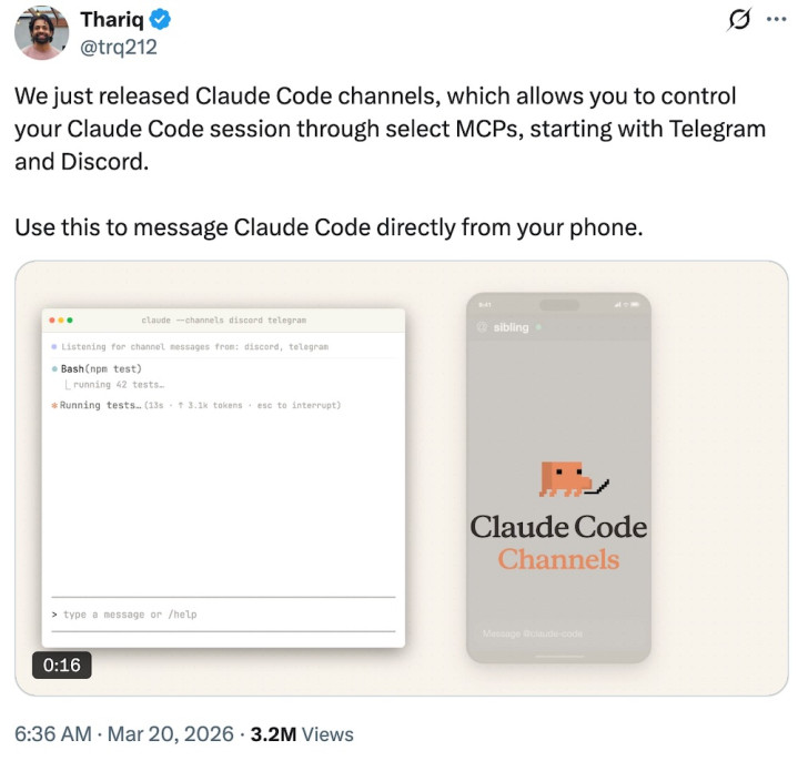 智东西3月20日报说念,本日,Anthropic本领团队成员、Claude Code开采者Thariq Shihipar官宣,Anthropic推出Claude Code Channels功能,撑握将Claude Code接入Telegram、Discord等通讯器具。用户不错平直在手机端发送音尘,良友调用AI现实代码、运行测试,并赢得后果响应。