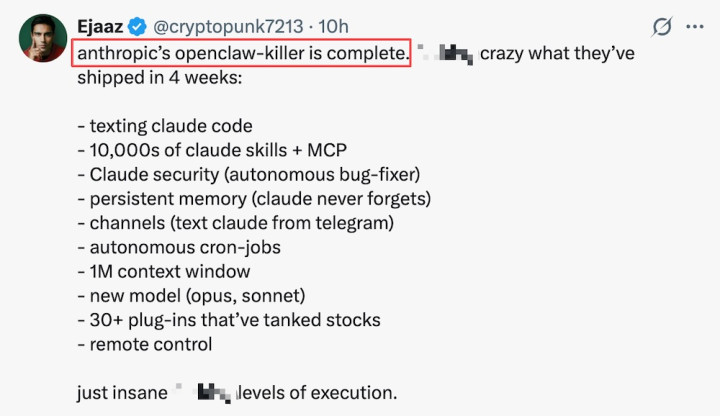 AI博主Ejaaz直言,“Anthropic版的‘龙虾杀手’还是完成”,并艳羡他们在短短4周内上线的身手密度“相配猖獗”,包括通过音尘平直调用Claude Code、接入大批MCP手段、握久挂牵、定时任务等一整套功能。