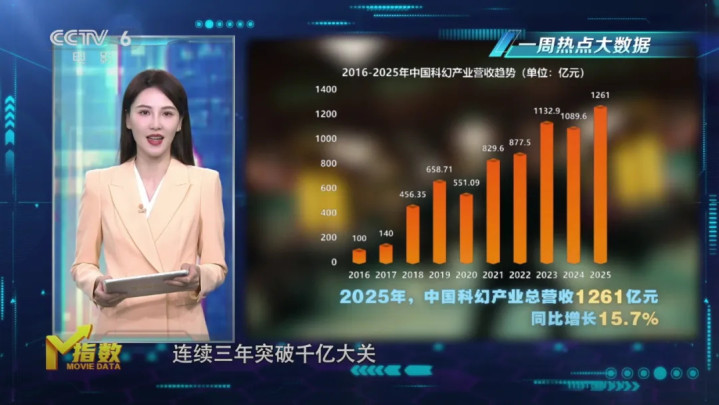 上周,中国科普究诘所发布了《2026中国科幻产业陈述》。2025年,中国科幻产业总营收达1261亿元,贯穿三年突破千亿大关。科幻影视产业全年营收81.6亿元,同比增长21.6%,国产科幻剧集和动画影响力执续进步,AIGC中短视频加快崛起。中国科幻产业稳步迈入高质地发展新阶段。
