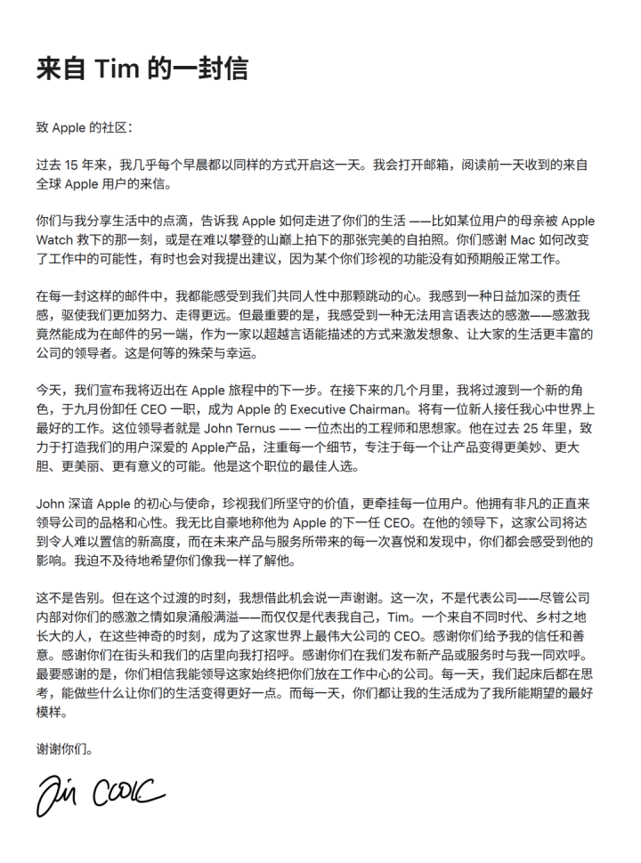 John深谙Apple的初心与责任,小器咱们所死守的价值,更惦记每一位用户。他领有不凡的廉正来指挥公司的品格和心性。我无比自重地称他为Apple的下一任CEO。在他的指挥下,这家公司将达到令东说念主难以置信的新高度,而在改日产物与服务所带来的每一次直快和发现中,你们王人会感受到他的影响。我迫不足待地但愿你们像我一样了解他。